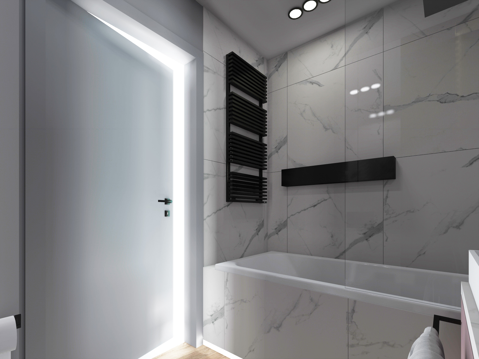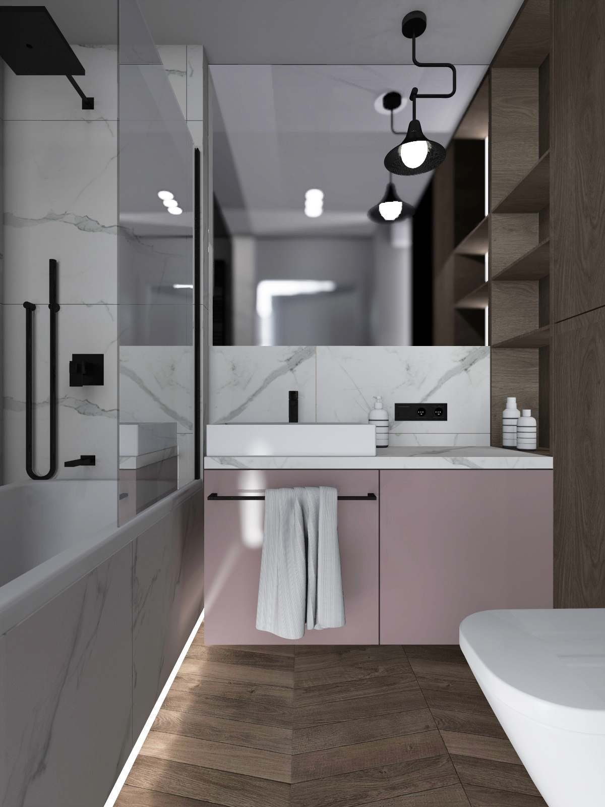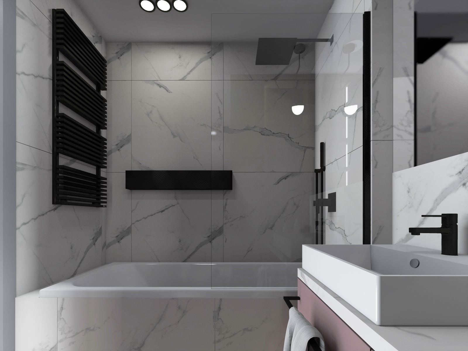 Projekt łazienki w wersji bardzo kobiecej. Połączenie płytek a’la marmur z pudrowym różem nadaje temu pomieszczeniu elegancki wygląd oraz niepowtarzalny klimat.